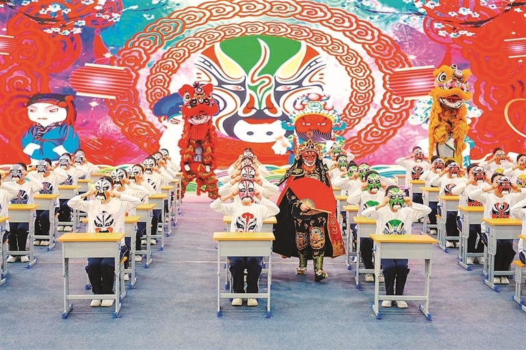 ▲介休市汾秀中学以戏曲脸谱为主题进行表演,推进校园美育浸润行动实施。?
