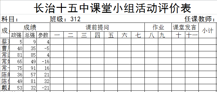 过去我在课堂提问时,既要对照自制的课堂活动评价表,又要对照教务下发的成绩表,后来我尝试把上述三项成绩信息附到课堂活动评价表中去,这样我在课堂提问时就更加心明眼亮了,不仅知道谁已经提问过了,谁还没有被提问过,还可以推测哪些问题可以让谁来回答,不适宜让谁来回答,哪些问题谁可能答到什么层次,谁可能答不到什么层次等等,进而提高了课堂提问的针对性。如图: